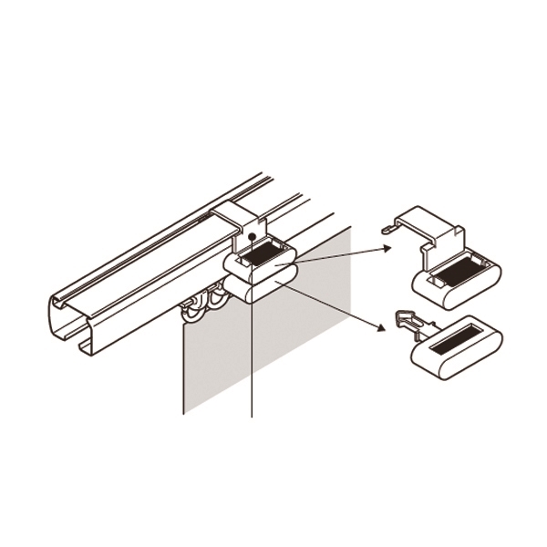 Endelokk med stopper i hvit og sort plast utførelse har feste av gardinkrok slik at gardinen ikke sklir bortover på skinnen når gardinen trekkes for.
