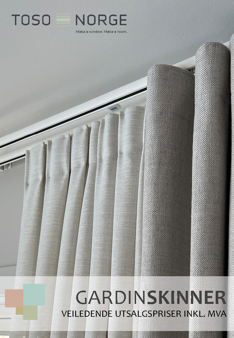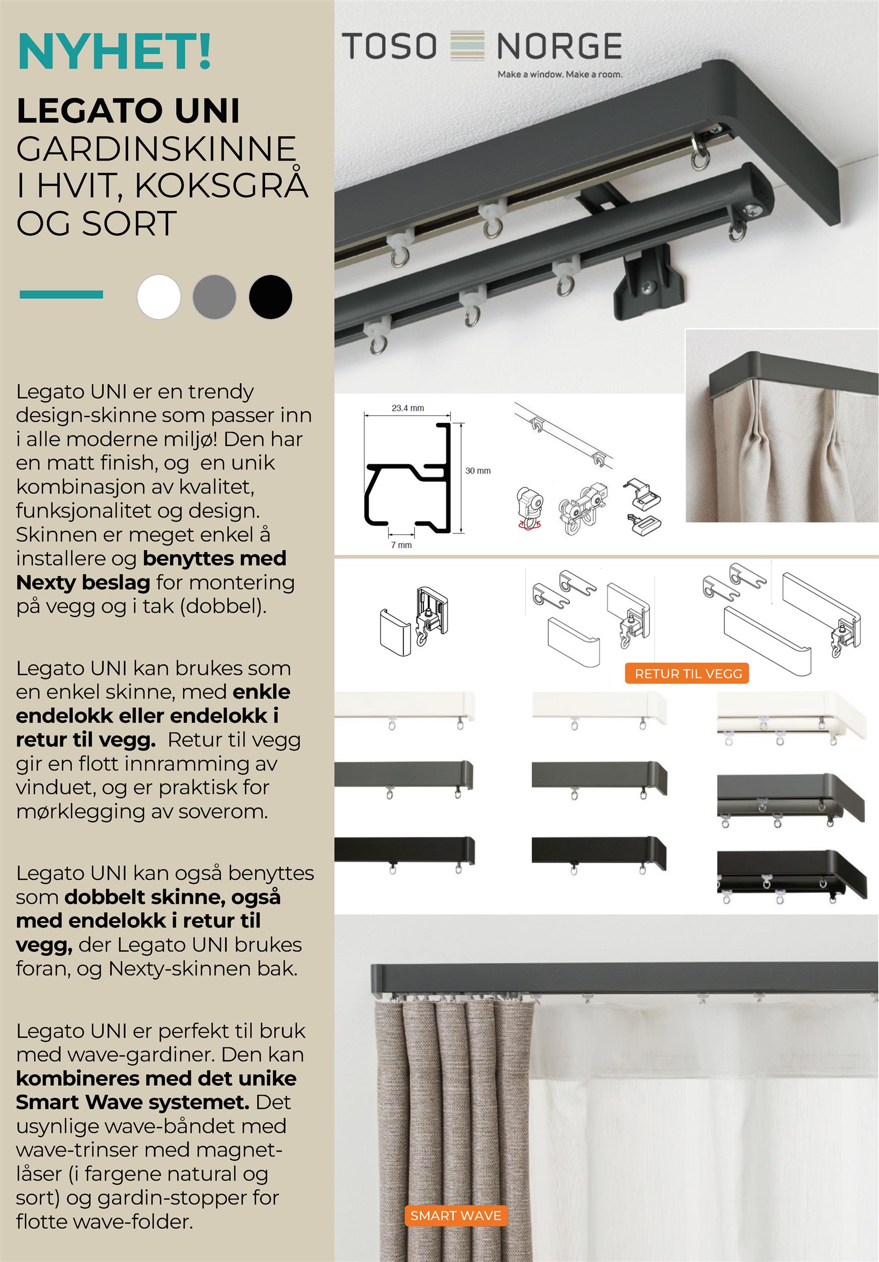 NYHETER 2025 Legato UNI gardinskinne med endelokk i retur til vegg Dobbel Legato UNI og Nexty gardinskinne Winpia gardinskinne i sort, hvit og sølv Sorte trinser til Nexty, Legato, New Delac, TI-8040 og Toso Smart Wave Ciero Line wavesnor 8 cm i sort TI-8040 motorisert gardinskinne i sort og hvit, inkl. Smart Wave system