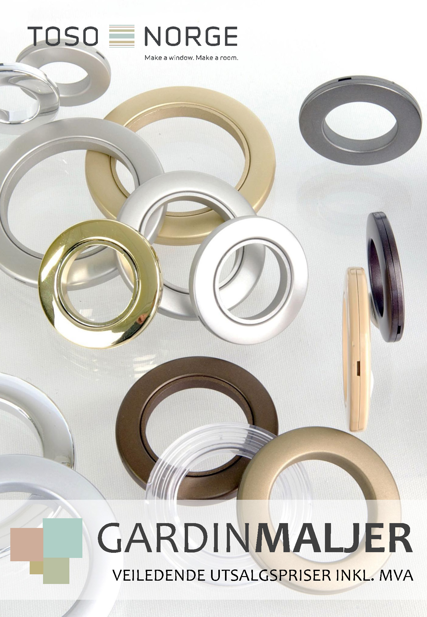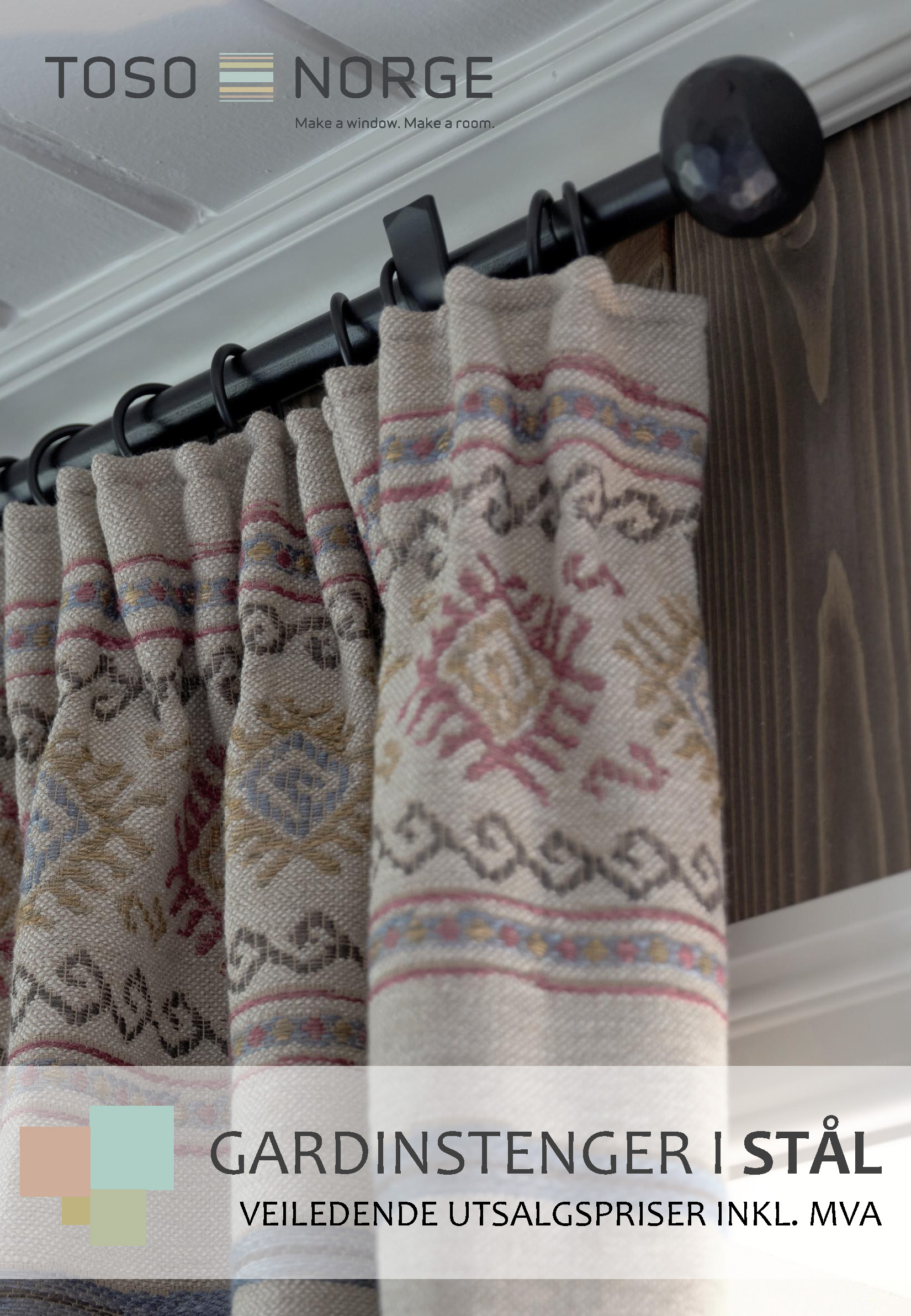 Madison stålstenger i gunmetal, matt graphite, antikk bronse og blank messing Hampton stålstenger i silkehvit, matt sort, matt nikkel og mørk bronse Lux stålstenger i rustfritt stål, krom, antikk messing og sort Smijern-stenger, håndlagde